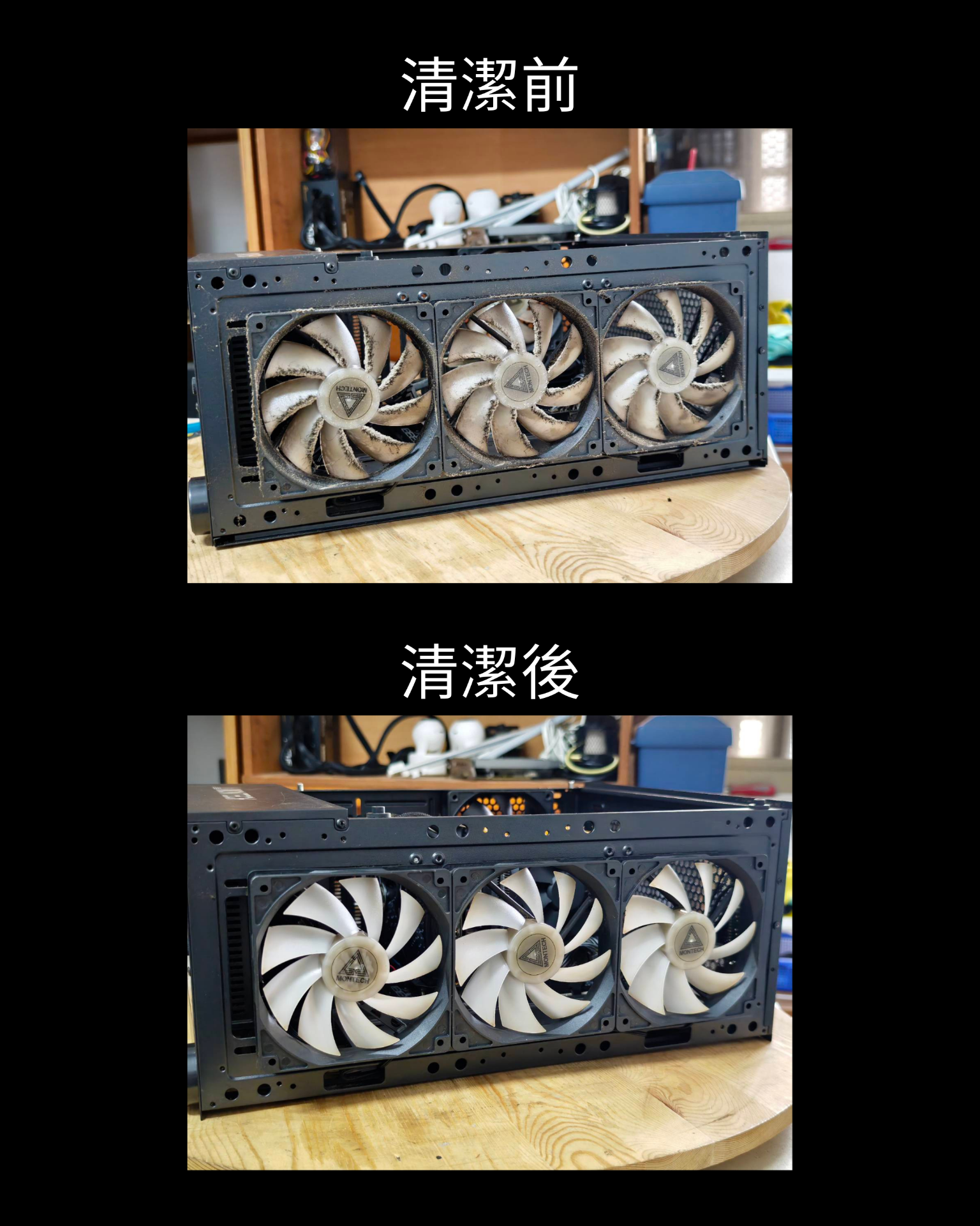 但是有很多卡在水冷排、風扇上面的頑固髒汙是風槍噴不起來的