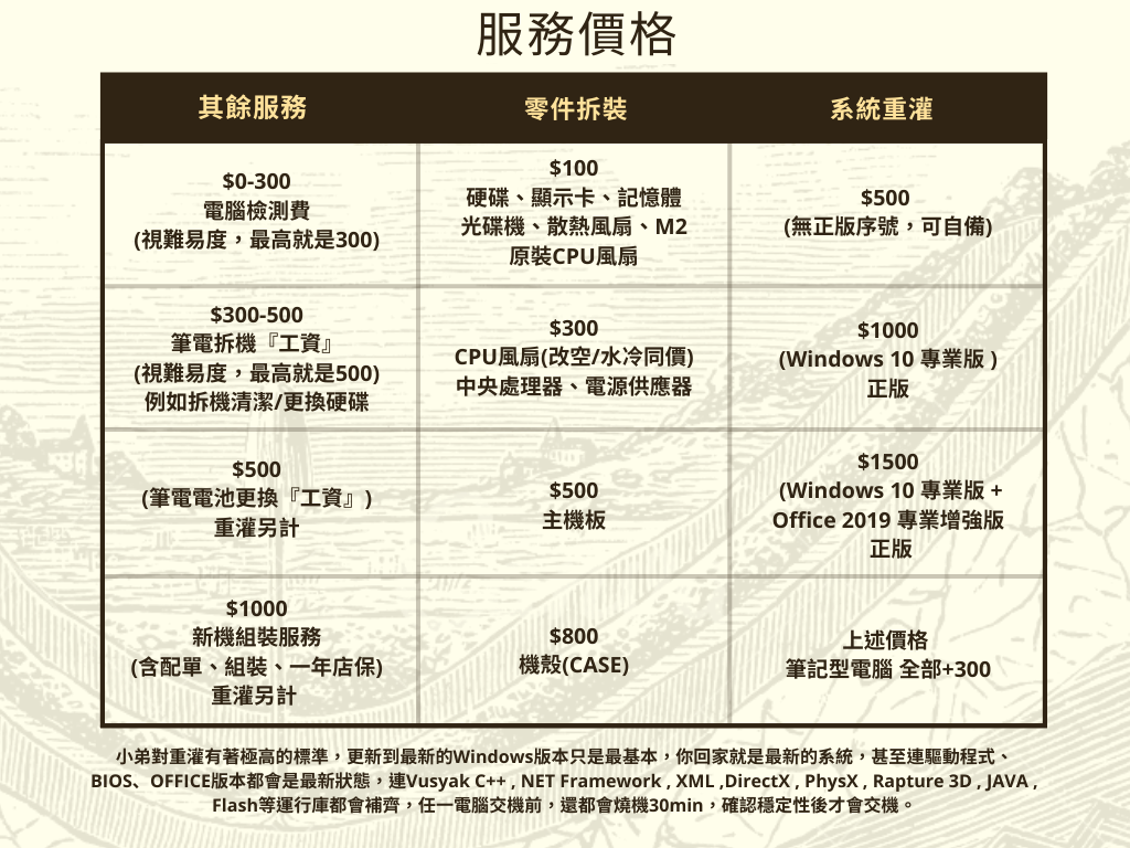 PC Gamer Studio 電腦玩家工作室對每個案例都有著極高的標準,更新到最新的Windows只是基本,甚至連驅動程式、BIOS、OFFICE版本都是最新狀態,連Vusyak C++ , NET Framework , XML , DirextX , PhysX , Rapture 3D , Java , Flash 等運行庫都會補齊,任一電腦交機前,都會燒機30min確認其穩定性,我知道有許多客製化的服務不在上列價格表內,歡迎主動詢問!謝謝!